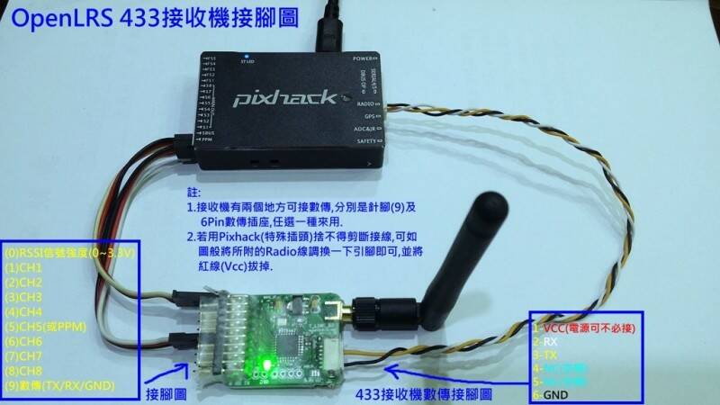 建議先用100mw的接收來試,如果不小心搞錯燒掉損失也較小,只須5V與飛控共用電源即可,由於功率小佈線可較隨意,也不必很注意干擾之類的細節,可遙控距離與1000mw一樣遠,只是數傳比較近(我測試約2KM,同樣環境3DR Radio不到0.5KM).